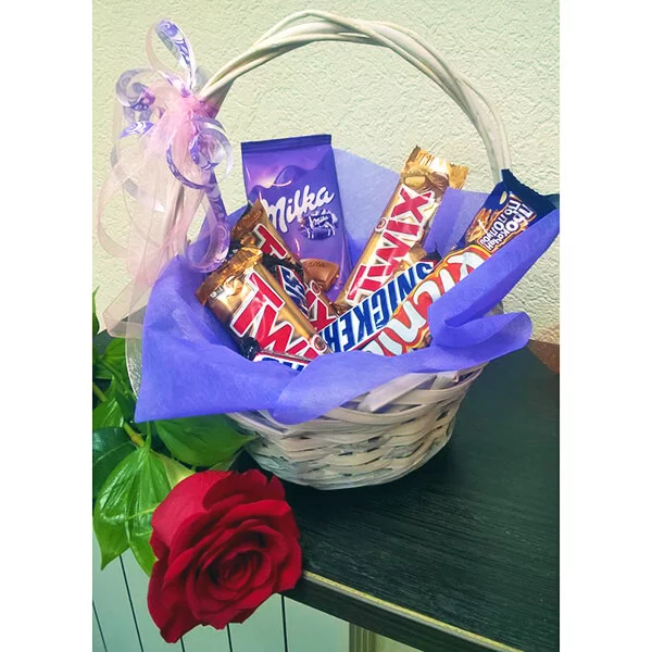 ЛЮКС: роза красная (70 см) - 1 шт., Twix - 4 шт., Snikers (маленький) - 4 шт., Picnic - 2 шт., шоколад "Milka" - 2 шт., декоративная зелень, корзина малая, фетр фиолетовый, бант сиреневый.