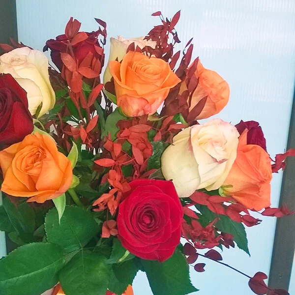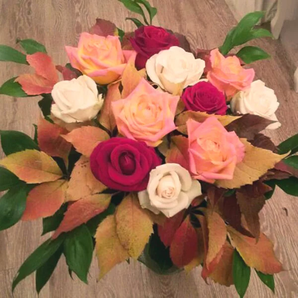 Выигрышное сочетание роз трех оттенков – нежного кремового, страстного красного и пленительного оранжевого – поможет выразить чувство благодарности и уважения. Дополненный осенними листьями букет не оставит равнодушной его получательницу