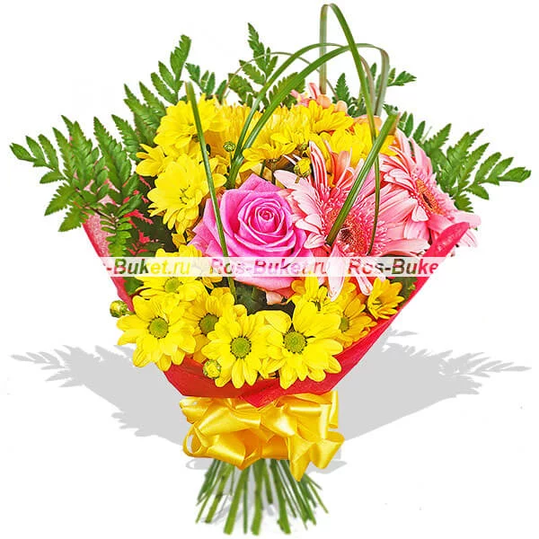 Стандартный (на фото): роза розовая (в центре) - 1 шт, гербера розовая - 3 шт, хризантема кустовая  желтая - 2 шт, хризантема одноголовая  желтая - 1 шт, папаратник - 3 шт, берграс, фетр розовый, бант желтый.