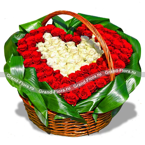 Великолепная корзина из красных и белых роз в виде сердца. Прекрасный подарок самому дорогому человеку,  который расскажет все о Ваших чувствах.