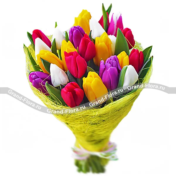 25 тюльпанов: разноцветные тюльпаны (фиолетовые, белые, желтые и красные)- 25 шт., натуральная упаковка желтая, лента.