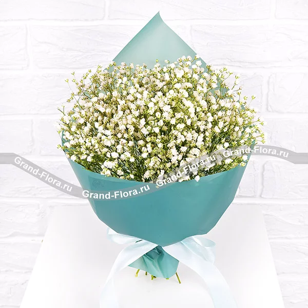 Люкс: гипсофила - 15 шт., упаковка, лента. Примерный размер 45Х45 см.