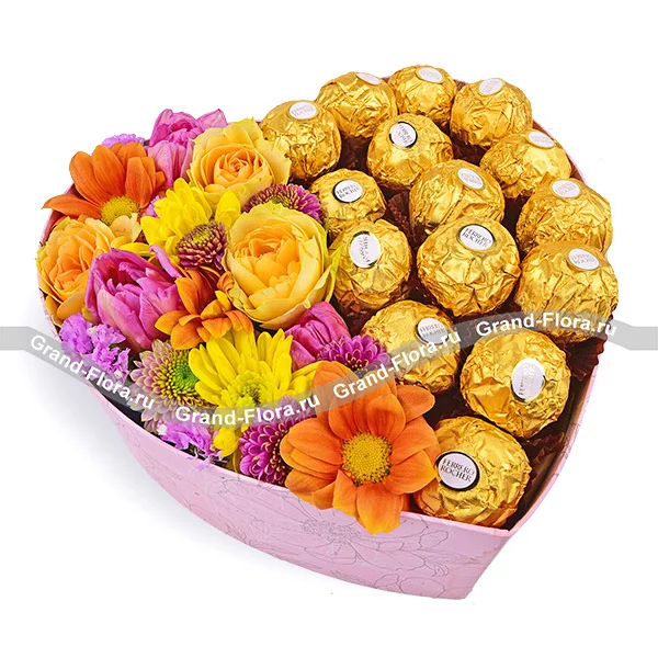 Стандартный: тюльпан фиолетовый - 3 шт., хризантема кустовая желтая - 1 шт., хризантема кустовая фиолетовая - 1 шт., хризантема кустовая оранжевая - 1 шт., статица, конфеты "Fererro Rocher" - 125гр., оазис, коробка.