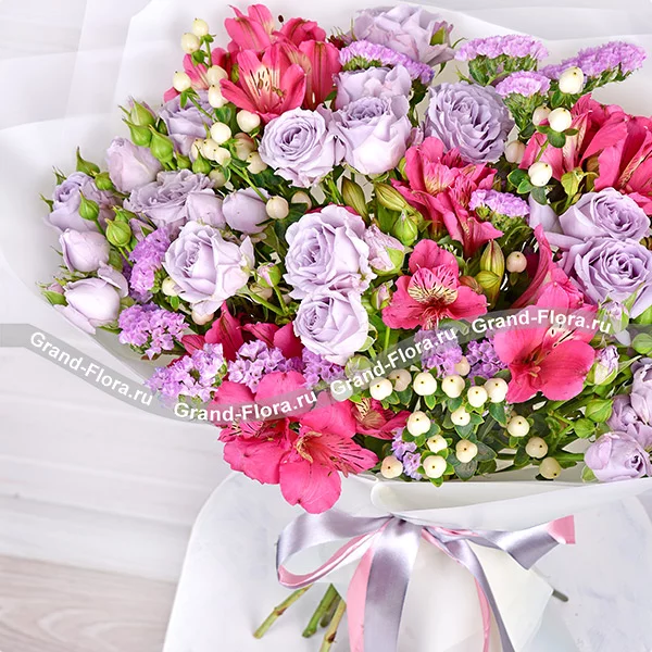 Кустовые розы светло-сиреневого оттенка гармонично сочетаются с розовой альстромерией и нежно-фиолетовой статицей. Подчеркивает воздушность и очарование цветочной композиции лунный гиперикум.